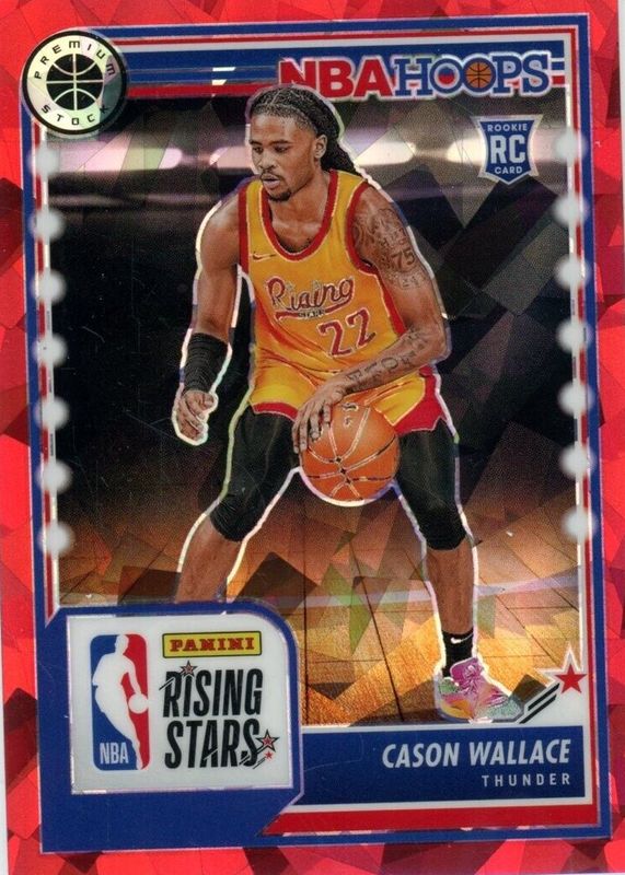 The Cason Wallace 2023 Hoops Premium Stock #281 Rising Stars - Red Ice /99 Rookie card in Raw condition has not changed in price in the last 30 days and was last sold for $1.33 .