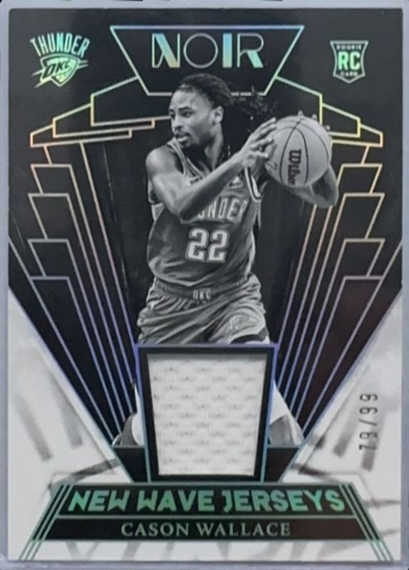 The Cason Wallace 2023 Noir #NWJ-CAS New Wave Jerseys /99 Rookie card is 1 of 83 Cason Wallace's card variations in the 2023 Noir set being tracked by Sports Card Investor, including #375 Base /99, #335 Base /99, #242 Base /99, #384 Base /99, and #175 Base /99.