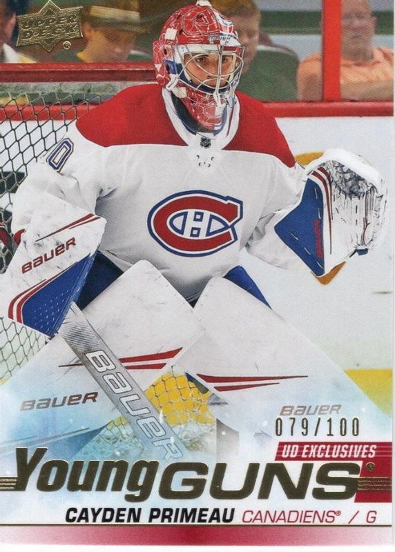 The Cayden Primeau 2019 Upper Deck #454 Young Guns - UD Exclusives /100 Rookie card in Raw condition has not changed in price in the last 30 days and was last sold for $35.61 .
