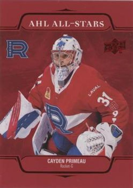 The Cayden Primeau 2021 Upper Deck AHL #AS-13 AHL All Stars - Red card is 1 of 3 Cayden Primeau's card variations in the 2021 Upper Deck AHL set being tracked by Sports Card Investor, including AHL All Stars, and AHL All Stars - Gold /25.