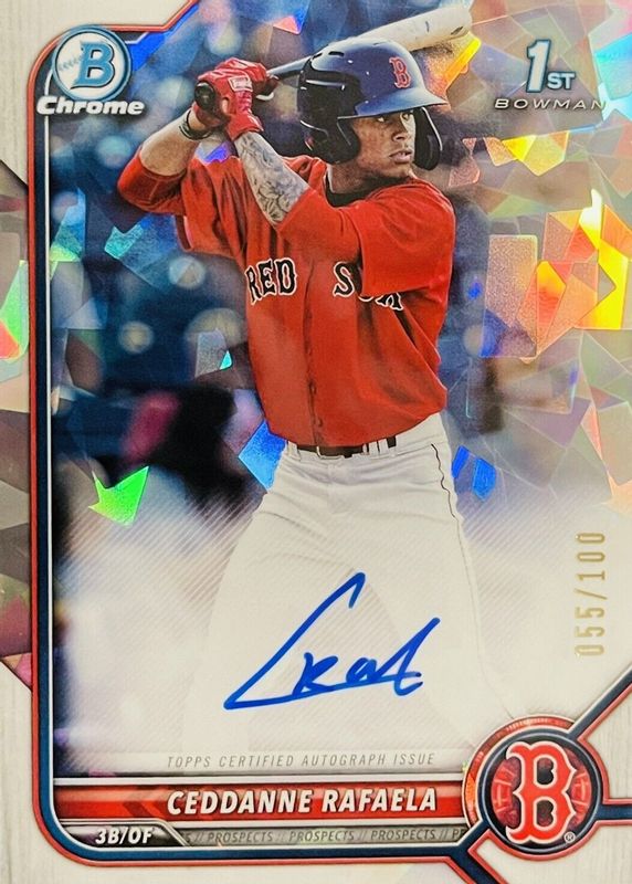 The Ceddanne Rafaela 2022 Bowman Chrome #CPA-CRL Prospect Auto - Atomic Refractor /100 (1st) card in Raw condition has not changed in price in the last 30 days and was last sold for $229.38 .