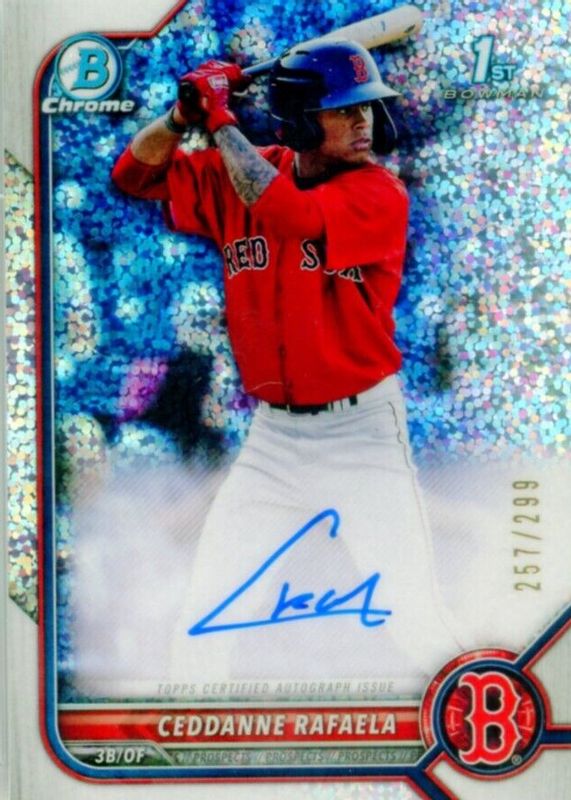 The Ceddanne Rafaela 2022 Bowman Chrome #CPA-CRL Prospect Auto - Speckle Refractor /299 (1st) card in Raw condition has not changed in price in the last 30 days and was last sold for $73.00 .