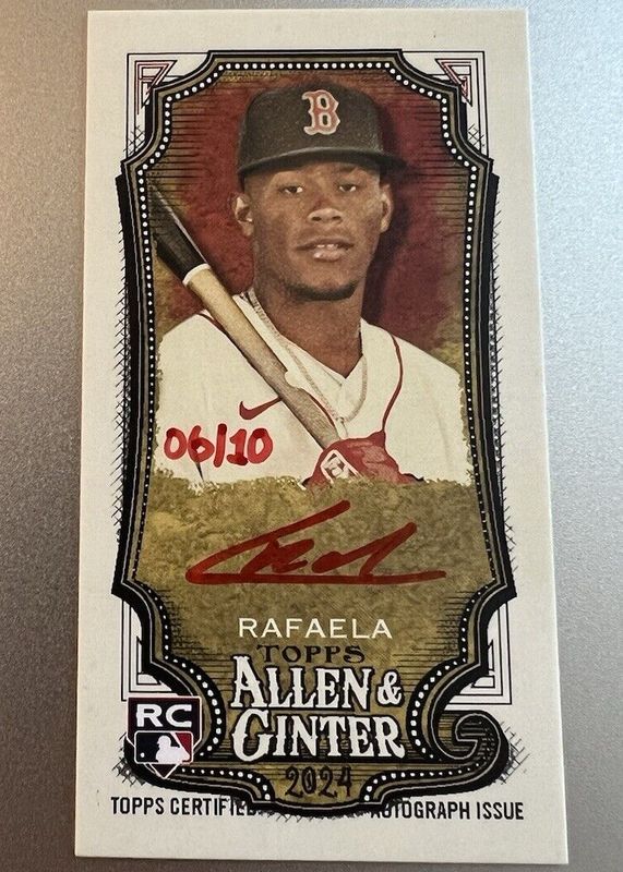 The Ceddanne Rafaela 2024 Topps Allen & Ginter #MA-CR Framed Mini Auto - Red Ink /10 Rookie card in Raw condition has not changed in price in the last 30 days and was last sold for $109.50 .