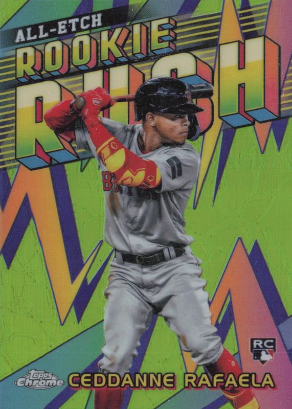 The Ceddanne Rafaela 2024 Topps Chrome #CERR-19 Chrome All-Etch Rookie Rush card in Raw condition has moved up $1.28 (+85.0%) in the last 30 days and was last sold for $2.78 .
