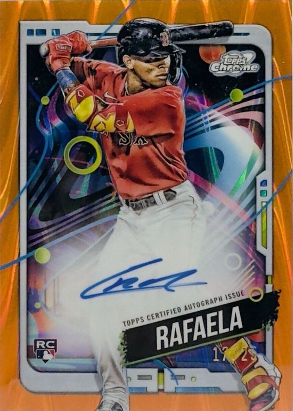 The Ceddanne Rafaela 2024 Topps Chrome Cosmic #CCA-CR Autographs - Orange Galactic Refractor /25 Rookie card in Raw condition has not changed in price in the last 30 days and was last sold for $129.17 .