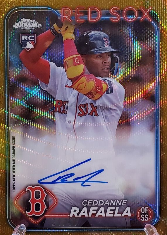 The Ceddanne Rafaela 2024 Topps Chrome #RA-CR Rookie Autographs - Gold Refractor /50 card in Raw condition has not changed in price in the last 30 days and was last sold for $90.00 .