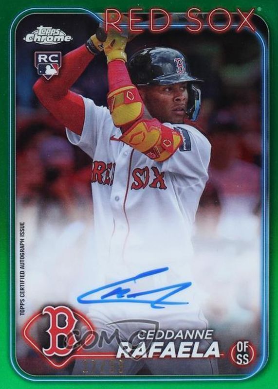 The Ceddanne Rafaela 2024 Topps Chrome #RA-CR Rookie Autographs - Green Refractor /99 card in Raw condition has not changed in price in the last 30 days and was last sold for $70.00 .