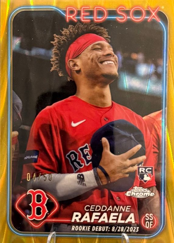 The Ceddanne Rafaela 2024 Topps Chrome Update #USC44 Rookie Debut - Gold RayWave Refractor /50 card in Raw condition has not changed in price in the last 30 days and was last sold for $10.00 .