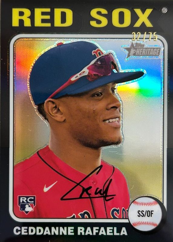 This card is 1 of 7 Ceddanne Rafaela's card variations in the 2024 Topps Heritage High Number set being tracked by Sports Card Investor, including Real One Autographs, Chrome /699, Chrome - Silver Border /225, Real One Autographs - Red Ink /75, and Chrome - Gold Border /5.