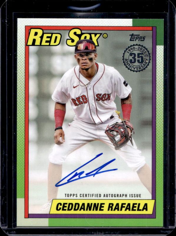The Ceddanne Rafaela 2025 Topps #90A-CED 1990 Baseball Autographs (Series 1) card is 1 of 119 Ceddanne Rafaela's card variations in the 2025 Topps set being tracked by Sports Card Investor, including Base, Aqua Holo Foil, Diamante Foil, Holo Foil, and Pink Diamante Foil.