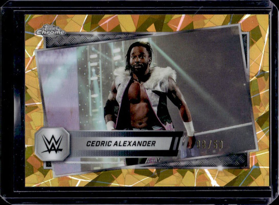The Cedric Alexander 2025 Topps Chrome WWE Sapphire Edition #143 Base Chrome - Gold Refractor /50 card is 1 of 11 Cedric Alexander's card variations in the 2025 Topps Chrome WWE Sapphire Edition set being tracked by Sports Card Investor, including Base Chrome, Blue Brand Autographs, Base Chrome - Green Refractor /75, Base Chrome - Orange Refractor /25, and Blue Brand Autographs - Orange Refractor /25.