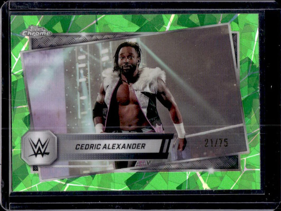 The Cedric Alexander 2025 Topps Chrome WWE Sapphire Edition #143 Base Chrome - Green Refractor /75 card is 1 of 11 Cedric Alexander's card variations in the 2025 Topps Chrome WWE Sapphire Edition set being tracked by Sports Card Investor, including Base Chrome, Blue Brand Autographs, Base Chrome - Gold Refractor /50, Base Chrome - Orange Refractor /25, and Blue Brand Autographs - Orange Refractor /25.
