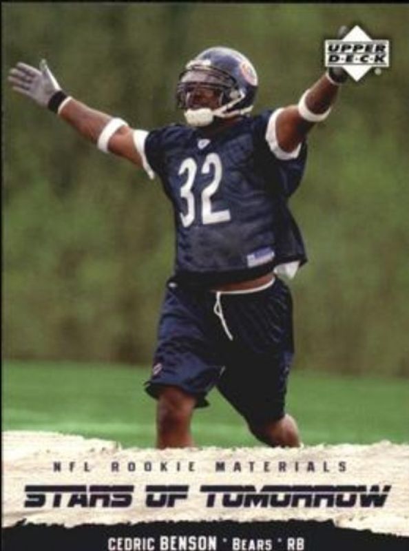 The Cedric Benson 2005 Upper Deck Rookie Materials #ST-7 Stars of Tomorrow card is 1 of 2 Cedric Benson's card variations in the 2005 Upper Deck Rookie Materials set being tracked by Sports Card Investor, including Base.
