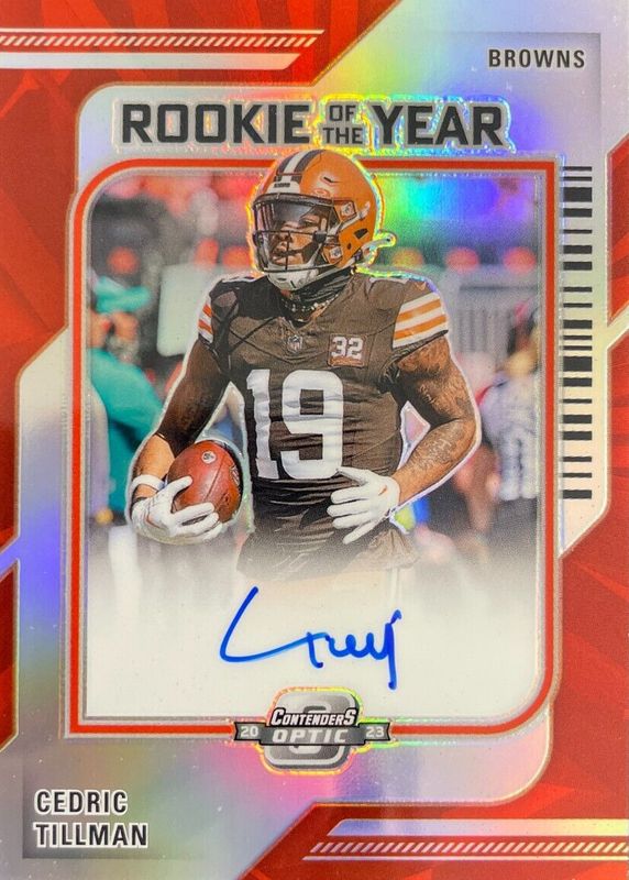 The Cedric Tillman 2023 Contenders Optic #ROY-CT Rookie of the Year Contenders Autographs (/99) card in Raw condition has not changed in price in the last 30 days and was last sold for $12.99 .