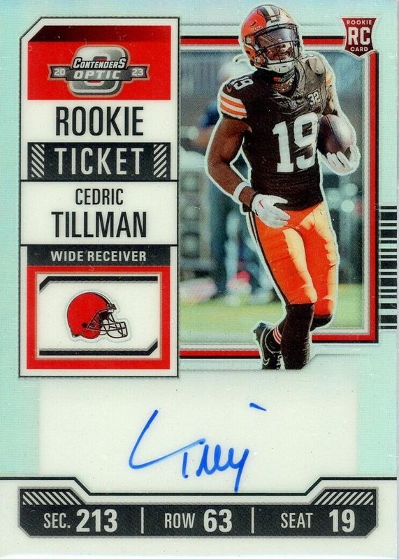 This card is 1 of 46 Cedric Tillman's card variations in the 2023 Contenders Optic set being tracked by Sports Card Investor, including Rookie of the Year Contenders Autographs (/99), Rookie of the Year Contenders Autographs - Blue (/75), Rookie Ticket Auto, Rookie Ticket Auto - Red (/175), and Rookie Ticket Auto Variation.