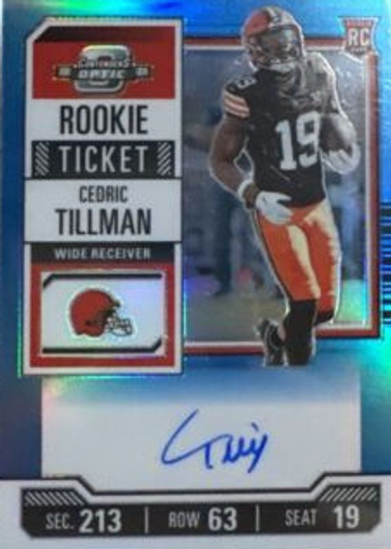 This card is 1 of 46 Cedric Tillman's card variations in the 2023 Contenders Optic set being tracked by Sports Card Investor, including Rookie of the Year Contenders Autographs (/99), Rookie of the Year Contenders Autographs - Blue (/75), Rookie Ticket Auto, Rookie Ticket Auto - Red (/175), and Rookie Ticket Auto - Silver.
