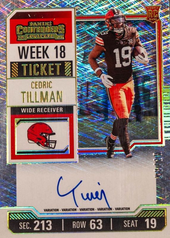 This card is 1 of 28 Cedric Tillman's card variations in the 2023 Contenders set being tracked by Sports Card Investor, including Rookie Ticket Auto, Rookie Ticket Auto - Opening Kickoff Ticket, Rookie Ticket Auto - Red Zone Ticket, Rookie Ticket Auto - Ticket Stub (/19), and Rookie Ticket Auto Variation.