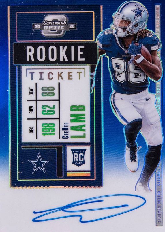 The CeeDee Lamb 2020 Contenders Optic #107 Rookie Ticket Auto - Blue /75 card in Raw condition has not changed in price in the last 30 days and was last sold for $257.50 .
