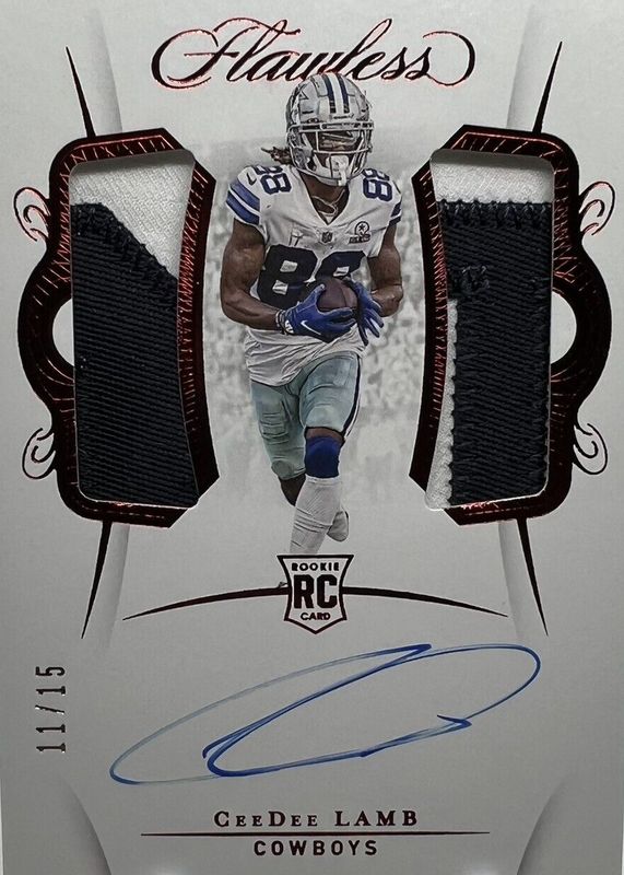 The CeeDee Lamb 2020 Flawless #RDPA-CD Rookie Dual Patch Auto - Ruby /15 card in Raw condition has not changed in price in the last 30 days and was last sold for $510.01 .