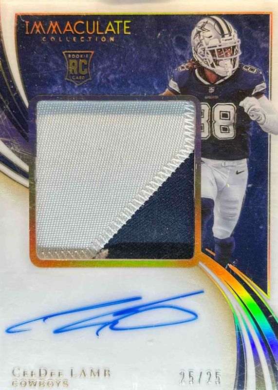 The CeeDee Lamb 2020 Immaculate #PPR-CDL Premium Patch Rookie Autographs - Gold /25 card in Raw condition has not changed in price in the last 30 days and was last sold for $239.38 .
