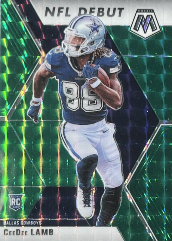 The CeeDee Lamb 2020 Mosaic #268 NFL Debut - Green Rookie card in Raw condition has moved down -$0.81 (-28.8%) in the last 30 days and was last sold for $2.00 .