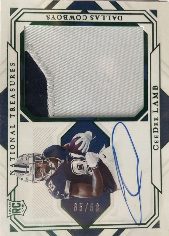 This card is 1 of 49 CeeDee Lamb's card variations in the 2020 National Treasures set being tracked by Sports Card Investor, including Rookie Patch Auto /99, Rookie Patch Auto - Green Jersey Number (/88), Rookie Patch Auto - Holo Silver /25, Rookie Patch Auto - Midnight /20, and Rookie Patch Auto - Stars & Stripes /20.