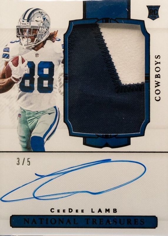 This card is 1 of 49 CeeDee Lamb's card variations in the 2020 National Treasures set being tracked by Sports Card Investor, including Rookie Patch Auto /99, Rookie Patch Auto - Green Jersey Number (/88), Rookie Patch Auto - Holo Silver /25, Rookie Patch Auto - Midnight /20, and Rookie Patch Auto - Stars & Stripes /20.