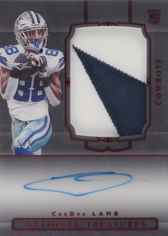 This card is 1 of 49 CeeDee Lamb's card variations in the 2020 National Treasures set being tracked by Sports Card Investor, including Rookie Patch Auto /99, Rookie Patch Auto - Green Jersey Number (/88), Rookie Patch Auto - Holo Silver /25, Rookie Patch Auto - Midnight /20, and Rookie Patch Auto - Stars & Stripes /20.