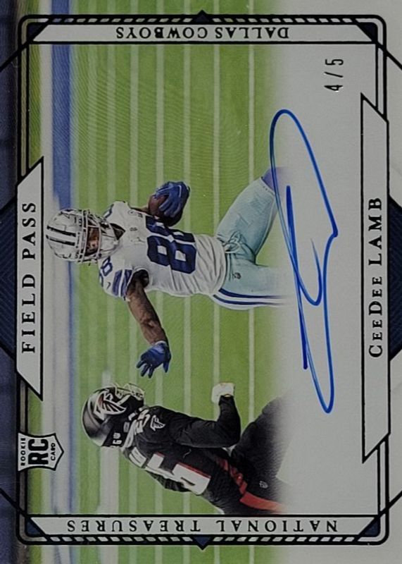The CeeDee Lamb 2020 National Treasures #FP-CL Rookie Signatures Field Pass - Black /5 card in Raw condition has not changed in price in the last 30 days and was last sold for $233.40 .
