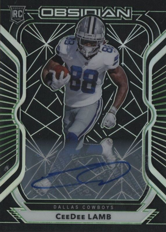 This card is 1 of 21 CeeDee Lamb's card variations in the 2020 Obsidian set being tracked by Sports Card Investor, including Rookie Autographs (/150), Rookie Autographs - Electric Etch Orange (/75), Rookie Autographs - Electric Etch Red (/10), Rookie Autographs - Electric Etch Yellow (/25), and Rookie Jersey Autographs (/150).