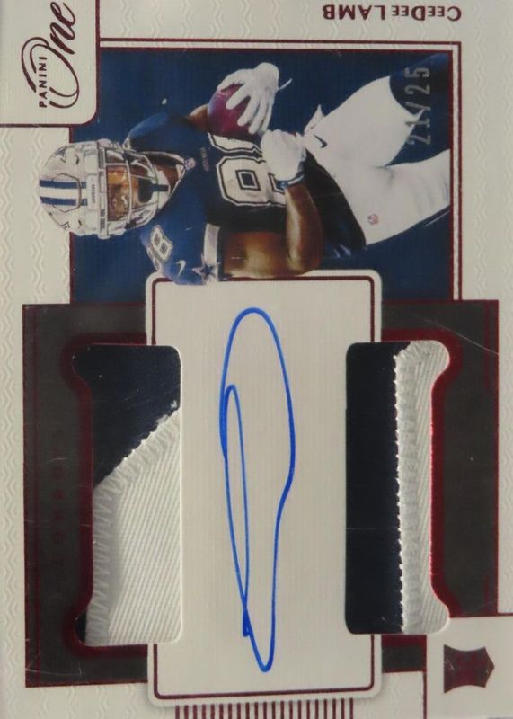 This card is 1 of 32 CeeDee Lamb's card variations in the 2020 One set being tracked by Sports Card Investor, including Precision Rookie Patch Autographs (/25), Rookie Autographs (/99), Rookie Autographs - Blue (/75), Rookie Autographs - Bronze (/35), and Rookie Autographs - Gold (/10).