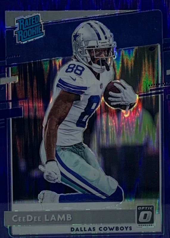 The CeeDee Lamb 2020 Optic #156 Purple Shock Rookie card in Raw condition has moved down -$6.00 (-37.5%) in the last 30 days and was last sold for $10.00 .