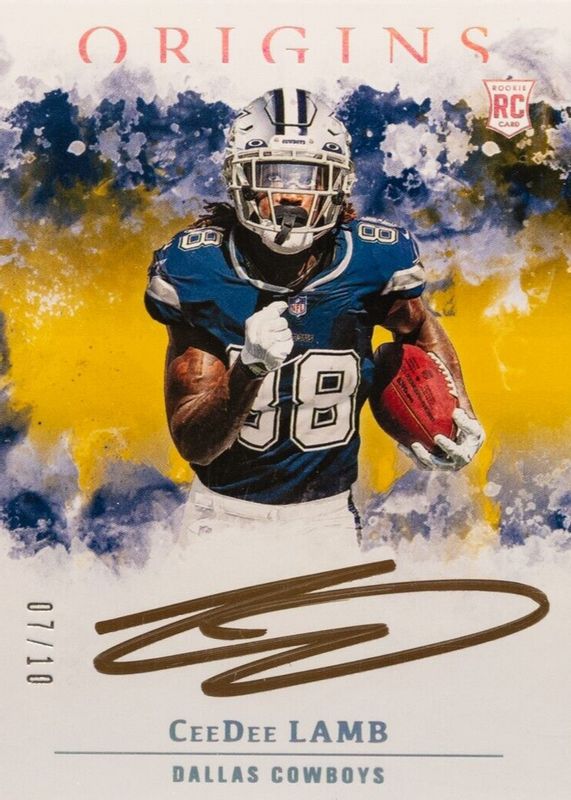 This card is 1 of 9 CeeDee Lamb's card variations in the 2020 Origins set being tracked by Sports Card Investor, including Rookie Autographs, Rookie Autographs - Red /99, Rookie Autographs - Blue /49, Rookie Autographs - Turquoise /25, and Rookie Autographs - Purple FOTL /17.