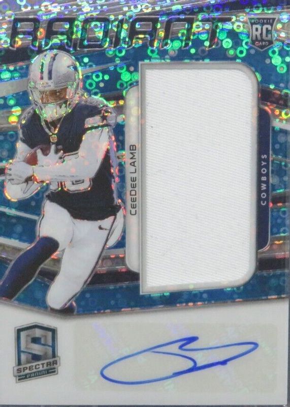The CeeDee Lamb 2020 Spectra #4 Radiant Rookie Patch Signatures - Neon Blue (/50) card in Raw condition has not changed in price in the last 30 days and was last sold for $202.50 .