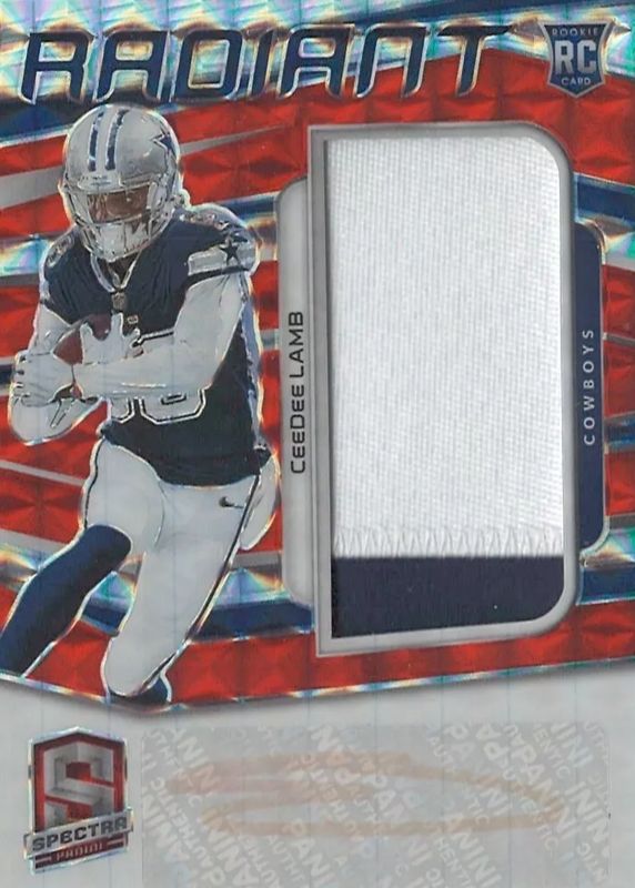 The CeeDee Lamb 2020 Spectra #4 Radiant Rookie Patch Signatures - Neon Orange (/15) card in Raw condition has not changed in price in the last 30 days and was last sold for $200.00 .