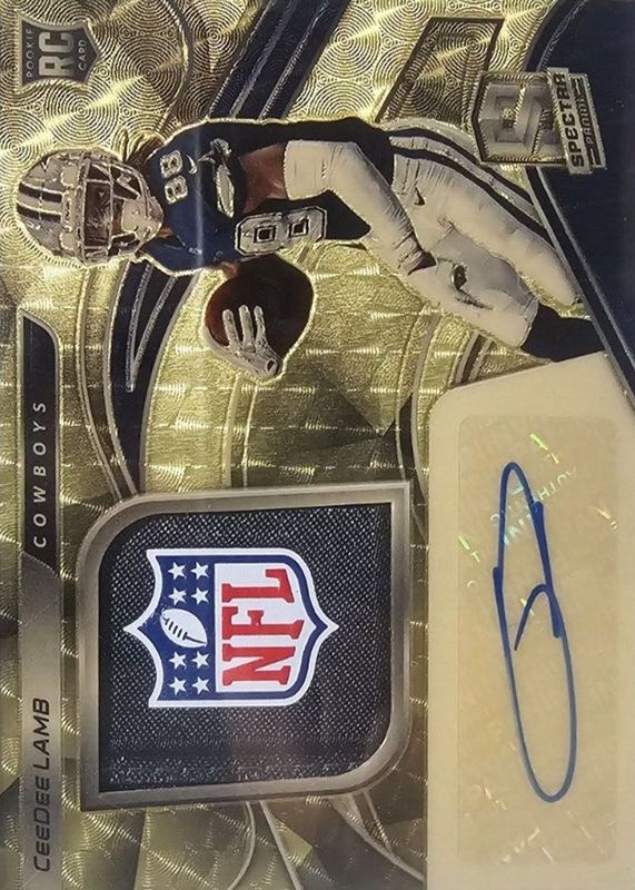 The CeeDee Lamb 2020 Spectra #208 Rookie Patch Auto - Gold /1 card in Raw condition has not changed in price in the last 30 days and was last sold for $1,000.00 .