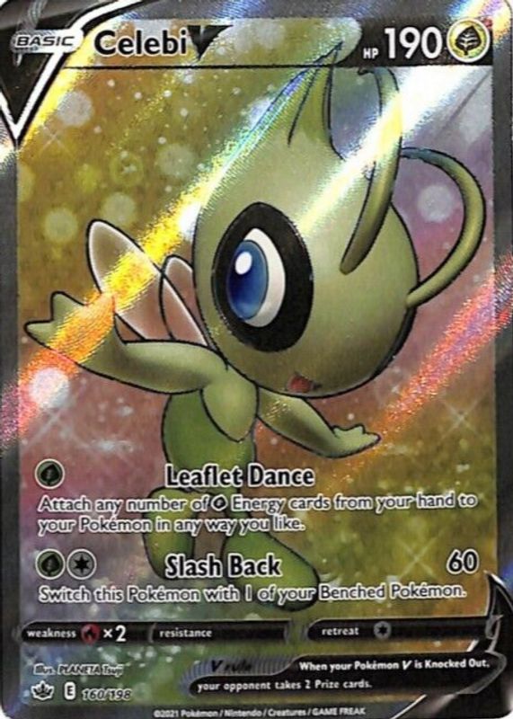 The Celebi V 2021 Sword & Shield: Chilling Reign #160/198 Holo (Full Art) card in Raw TCG (Near Mint) condition has not changed in price in the last 30 days and was last sold for $10.33 .