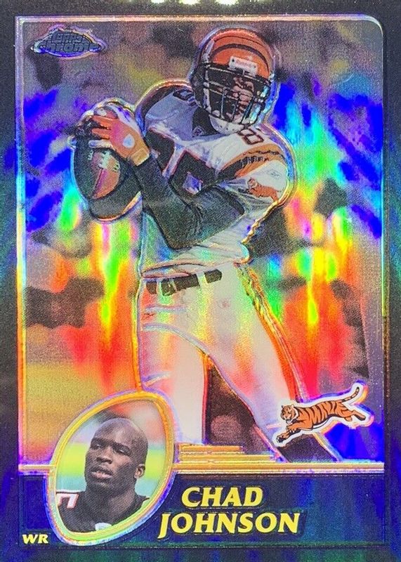 Chad Johnson's Football cards are available in at least 52 sets. Chad Johnson's biggest 7-day price movers are 2003 Topps Chrome #91 Black Refractor /599, 2001 Topps Chrome #259 Refractor /999, and 2025 Donruss #18 Base.