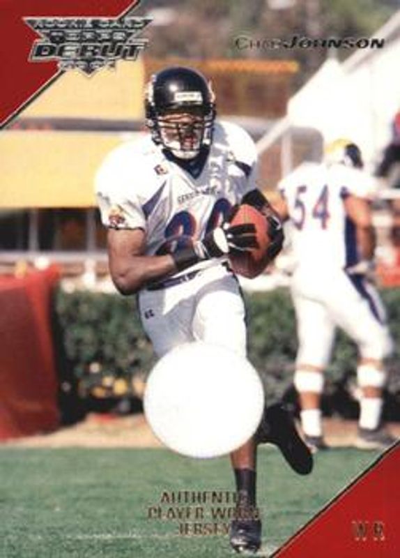 The Chad Johnson 2001 Topps Debut #128 Base /499 Rookie card is 1 of 2 Chad Johnson's card variations in the 2001 Topps Debut set being tracked by Sports Card Investor, including Redemption.