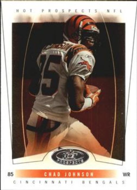 The Chad Johnson 2004 Fleer Hot Prospects #67 Base /350 card is 1 of 10 Chad Johnson's card variations in the 2004 Fleer Hot Prospects set being tracked by Sports Card Investor, including Red Hot /50, White Hot /1, Draft Rewind, Draft Rewind Jersey /154, and Draft Rewind Jersey Patches /64.