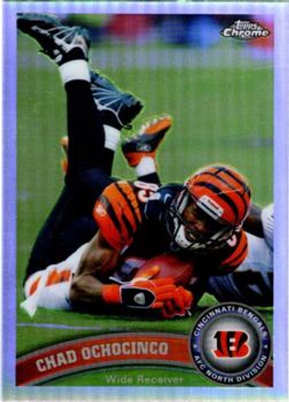 The Chad Johnson 2011 Topps Chrome #57 Refractor card is 1 of 16 Chad Johnson's card variations in the 2011 Topps Chrome set being tracked by Sports Card Investor, including Base, Orange Refractor, X-Fractor, Purple Refractor /499, and Black Refractor /299.