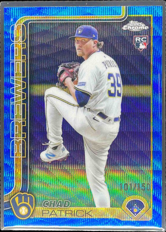 The Chad Patrick 2025 Topps Chrome Update #USC90 Blue Wave Refractor /150 Rookie card is 1 of 74 Chad Patrick's card variations in the 2025 Topps Chrome Update set being tracked by Sports Card Investor, including Base, Geometric Refractor, Negative Refractor, Prism Refractor, and RayWave Refractor.