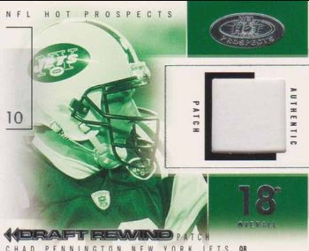 The Chad Pennington 2004 Fleer Hot Prospects #DR/CP2 Draft Rewind Jersey Patches /64 card is 1 of 16 Chad Pennington's card variations in the 2004 Fleer Hot Prospects set being tracked by Sports Card Investor, including Base /350, Red Hot /50, White Hot /1, Draft Rewind, and Hot Materials /500.