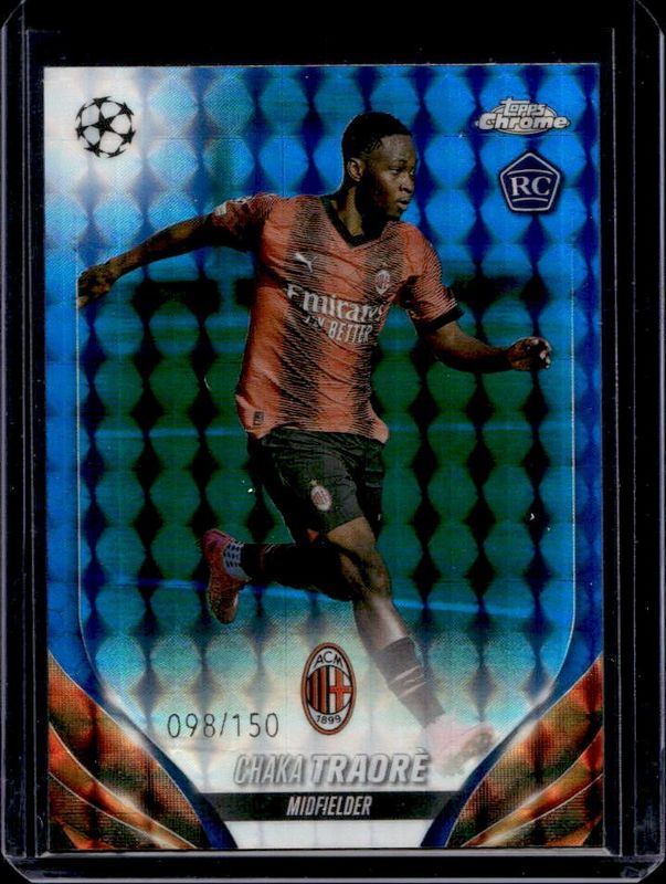 The Chaka Traore 2023 Topps Chrome UEFA Club Competitions #25 Blue Geometric Refractor /150 card is 1 of 50 Chaka Traore's card variations in the 2023 Topps Chrome UEFA Club Competitions set being tracked by Sports Card Investor, including Base, Aqua Lava Refractor, Aqua Prism Refractor, Blue Lava Refractor, and Gold Lava Refractor.