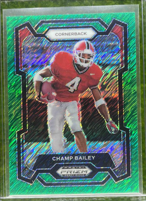 The Champ Bailey 2024 Prizm Draft Picks #38 Green Shimmer /8 card is 1 of 57 Champ Bailey's card variations in the 2024 Prizm Draft Picks set being tracked by Sports Card Investor, including Base, Green, Purple Wave, Red Ice, and Ruby Wave.