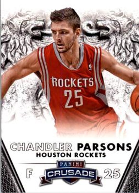 The Chandler Parsons 2013 Crusade #84 Base card is 1 of 13 Chandler Parsons' card variations in the 2013 Crusade set being tracked by Sports Card Investor, including Silver /25, Gold /10, 2014 National Blue /5, Black /1, and Crusade Blue.
