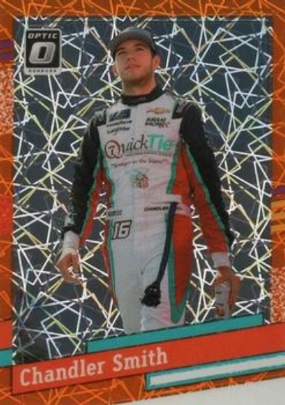 The Chandler Smith 2024 Donruss NASCAR #141 Optic Orange Velocity card is 1 of 56 Chandler Smith's card variations in the 2024 Donruss NASCAR set being tracked by Sports Card Investor, including #141 Base, #55 Base, #141 Optic, #55 Optic, and #141 Optic Black Pandora.
