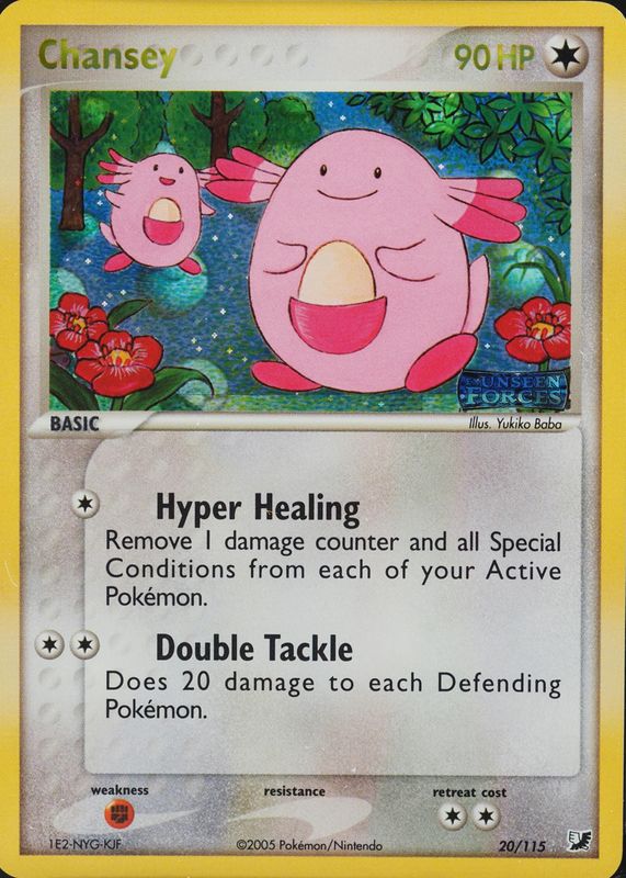 The Chansey 2005 EX: Unseen Forces #020/115 Reverse Holo card in Raw TCG (Near Mint) condition has moved down -$18.98 (-47.5%) in the last 30 days and was last sold for $21.01 .