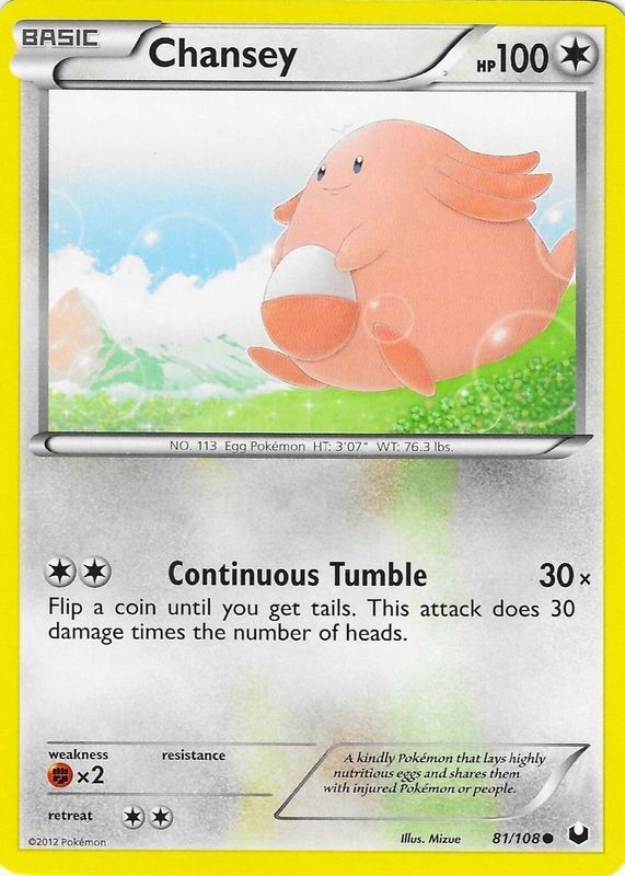 The Chansey 2012 Black & White: Dark Explorers #081/108 Base card in Raw TCG (Near Mint) condition has moved down -$1.67 (-58.0%) in the last 30 days and was last sold for $1.21 .