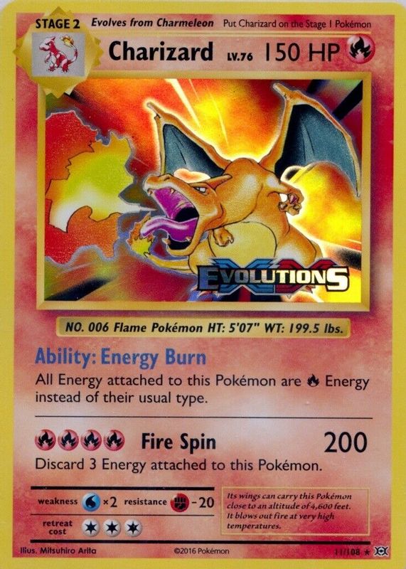 The Charizard 2016 XY: Evolutions #011/108 Holo (Prerelease) card in Raw TCG (Moderately Played) condition has not changed in price in the last 30 days and was last sold for $342.53 .